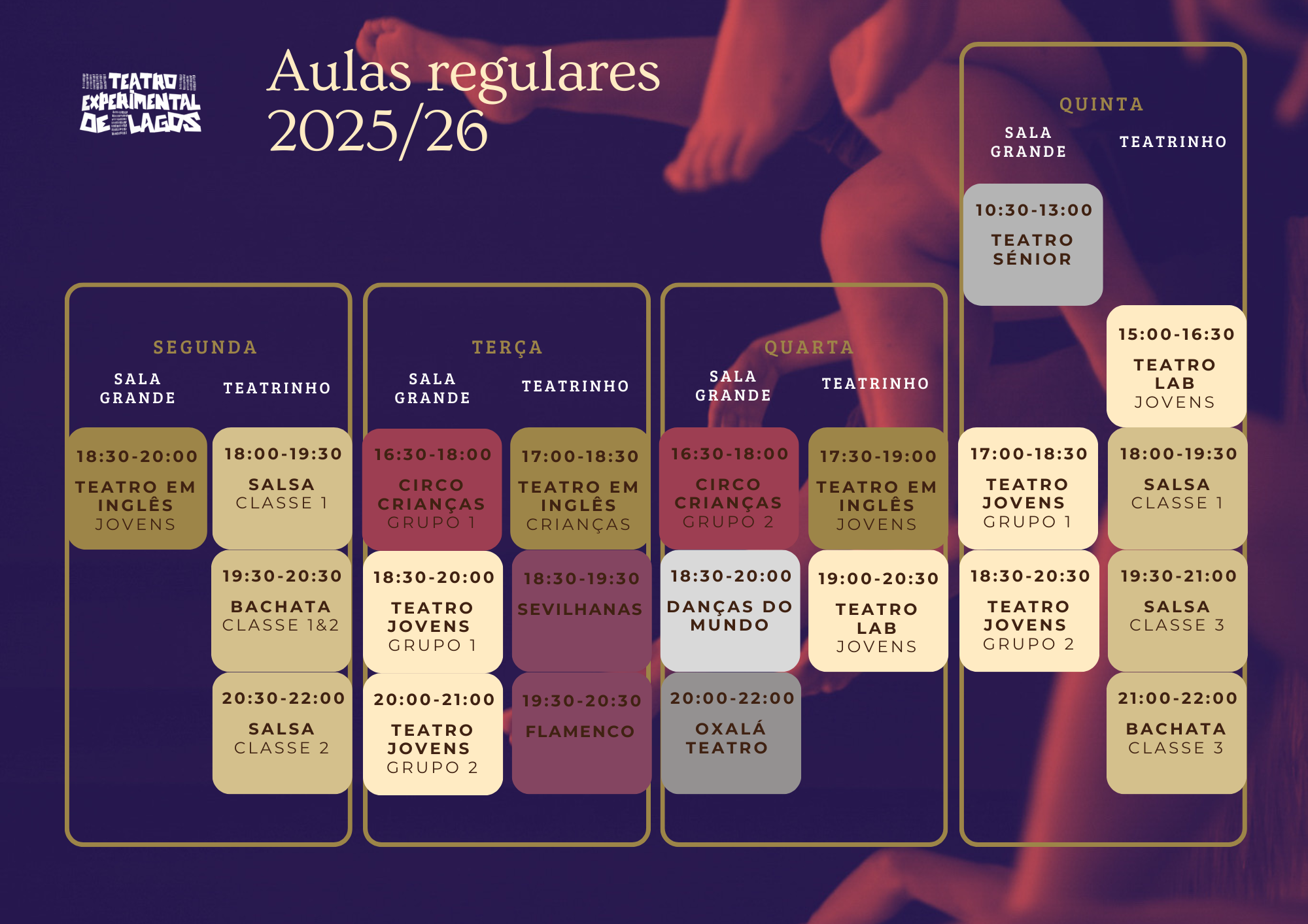 SALSA CLASSE 1: Segundas e Quintas 18:00-19:30 // SALSA CLASSE 2: Segundas 20:30-22:00 // SALSA CLASSE 3: Quintas 19:30-21:00